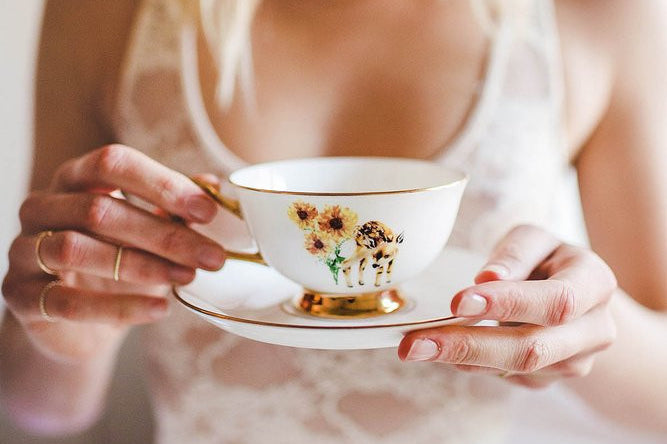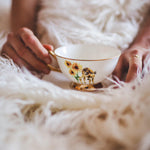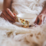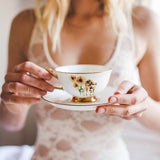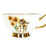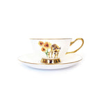 This tea cup and saucer set features an original hand painted illustration printed on both sides of the fine bone china cup, with gold accents to complete the pretty, folksy look.