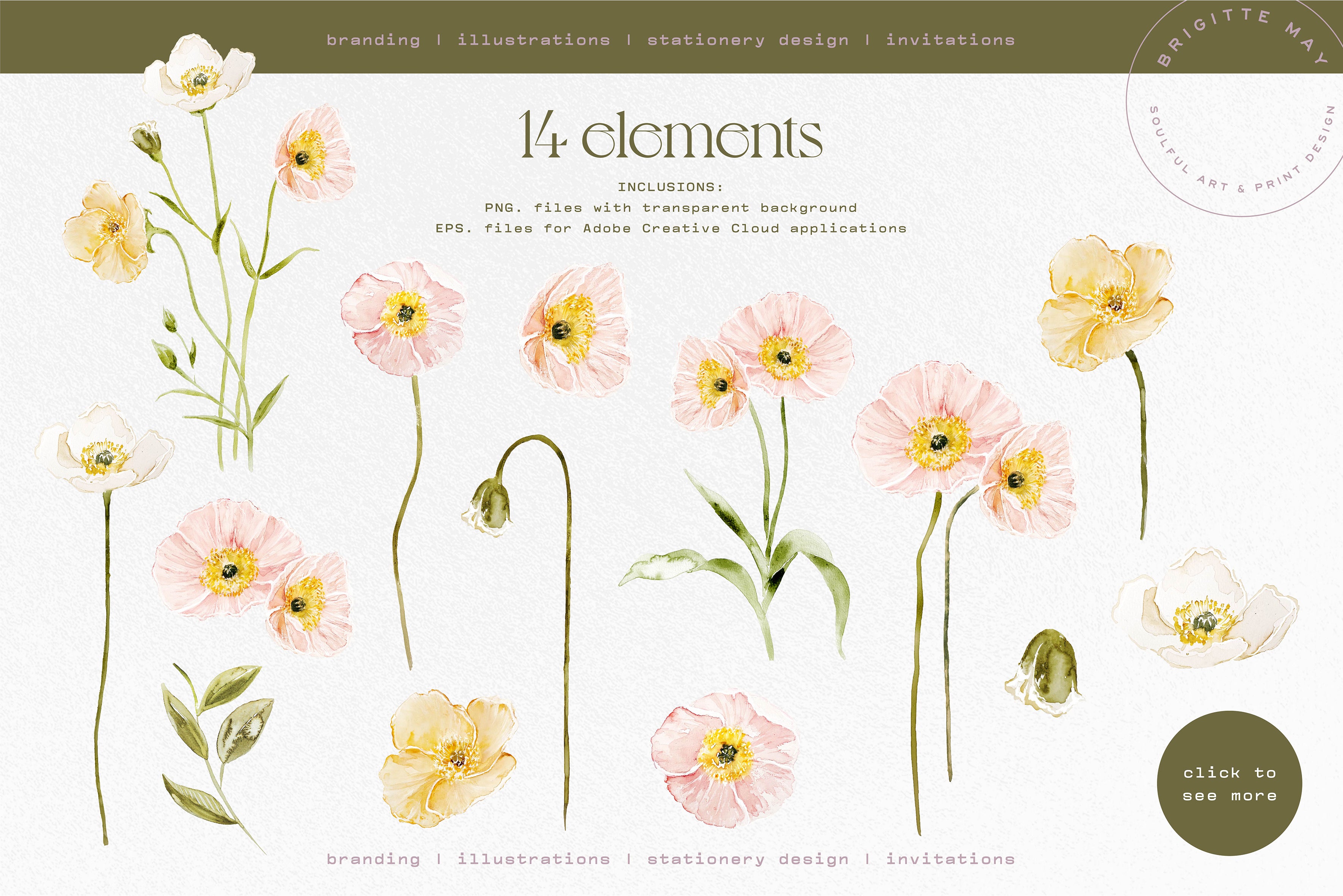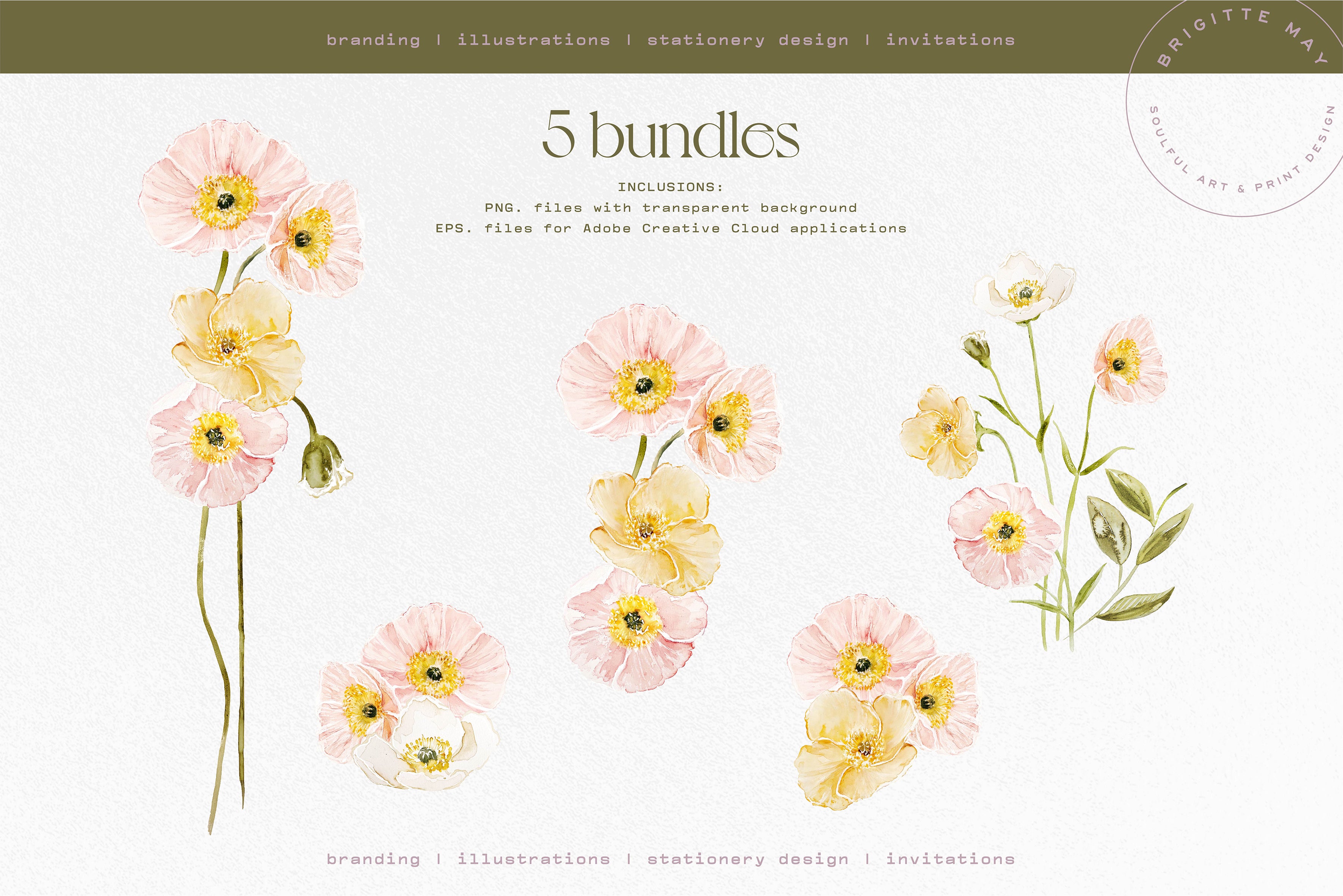 You may use this Poppy set to create art prints, branding/packaging design, prints for bed linen, stationery, homewares, wall decals...The options are endless!